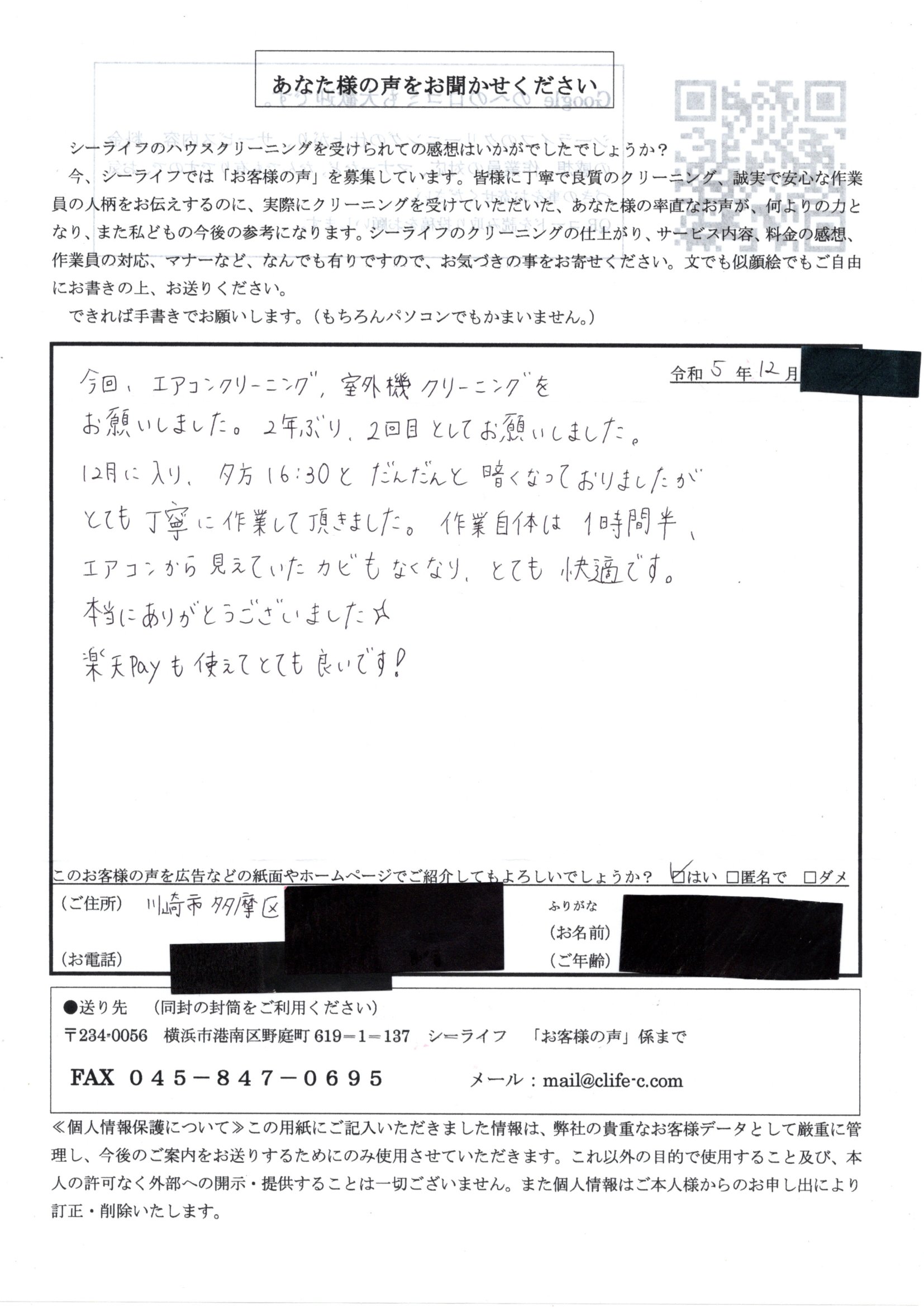 エアコン、室外機のクリーニングをご利用いただいた川崎市多摩区のお客様からいただいたお客様の声です。