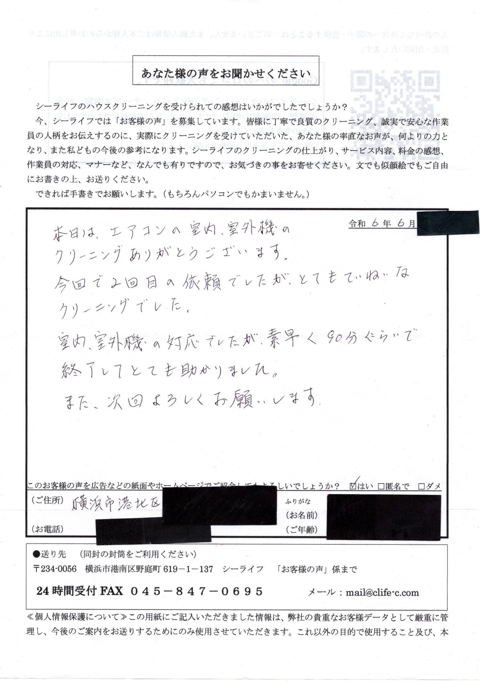 お客様の声 |エアコン横浜市港北区R6年6月 | シーライフ