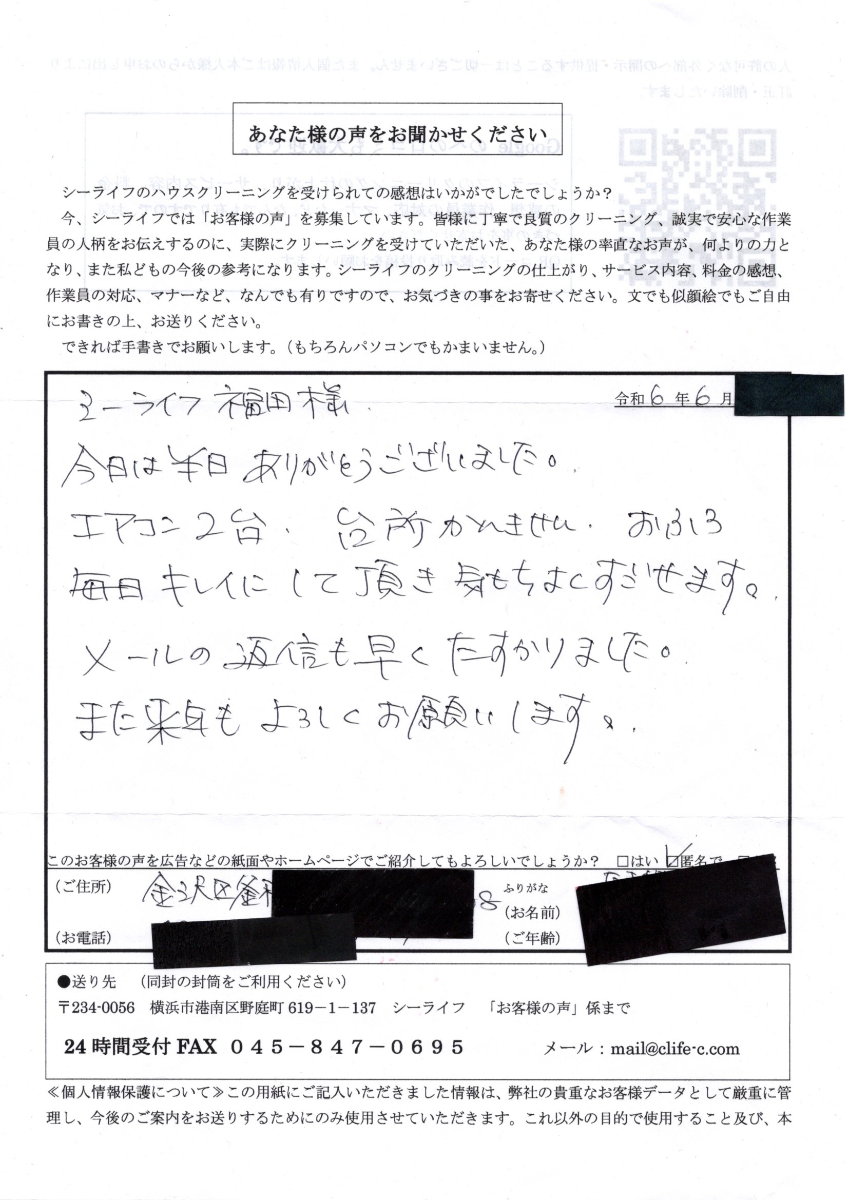 エアコン・換気扇・浴室・浴室多機能換気扇のクリーニングをご利用いただいた横浜市金沢区のお客様からいただいたお客様の声です。